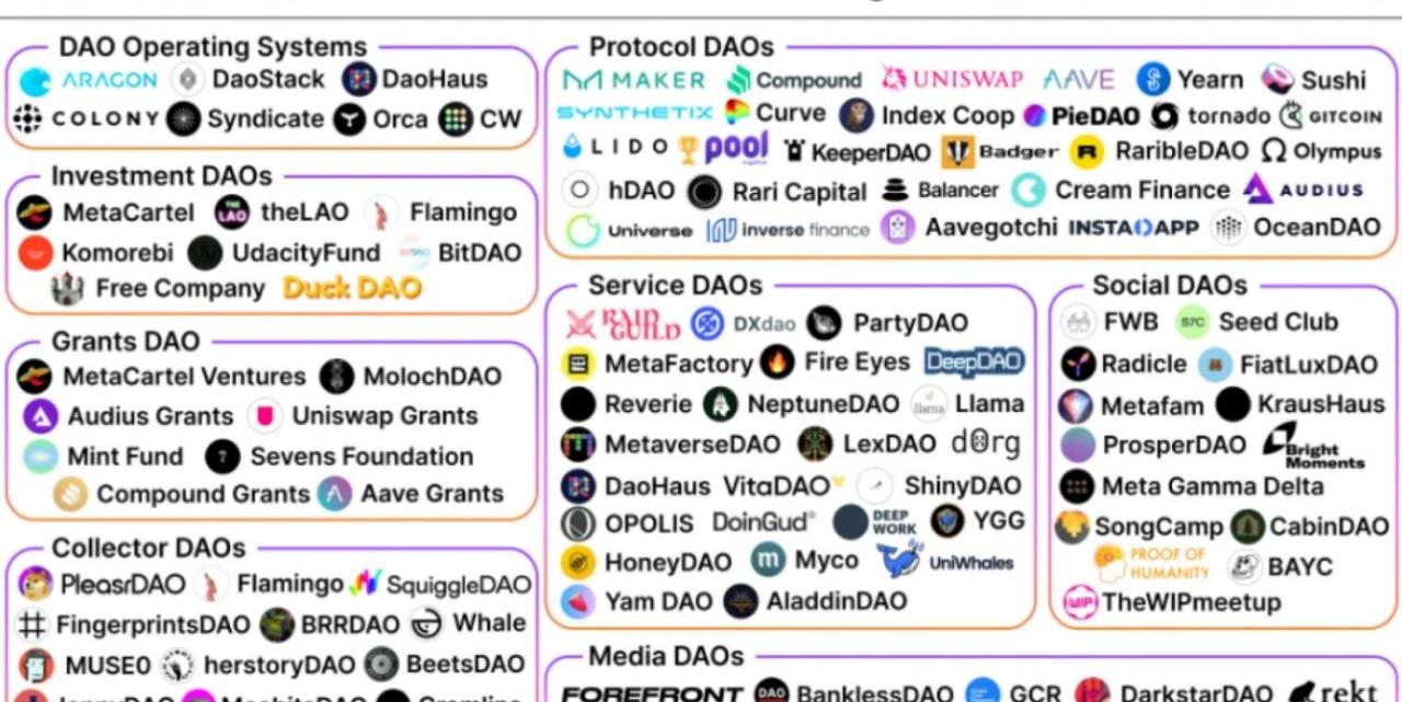 DAO最终将取代传统模型。DAO是一个互联网原生组织,其核心功能通过智能合约实现自动化,并由从事自动化无法实现的事情的人员组成。在实践中,并非所有DAO都是去中心化或自治的,因此最好将DAO视为基于互联网的组织,由其成员共同拥有和控制。尽管DAO还处于早期发展阶段,但它们不再只是一个充满希望的概念。他们是真正的组织,管理着数十亿美元的资本,为数百万人提供真正的产品和服务,并为人们创造新的创收方式。这是CooperTurley对当前DAO格局的一个很好的概述: