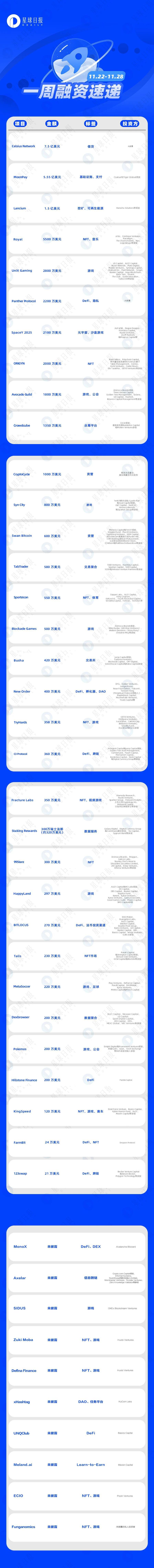 加密借贷平台CelsiusNetworkB轮融资额已超额认购,融资额度增至7.5亿美元加密借贷平台CelsiusNetwork首席执行官AlexMashinsky表示,CelsiusNetworkB轮融资额增至7.5亿美元,目前已超额认购。今年10月,Celsius完成了由WestCap和CDPQ领投的4亿美元融资,估值2.5亿美元。新资金将用于扩大产品供应、开拓市场,并通过新项目CelsiusX进一步连接中心化金融和DeFi。Celsius的资产管理规模已增至286亿美元。加密支付公司MoonPay以34亿美元估值完成5.55亿美元A轮融资,Coatue和TigerGlobal领投加密支付基础设施公司MoonPay宣布完成5.55亿美元的A轮股权融资,Coatue和TigerGlobal领投,投后估值为34亿美元。新融资将用于招聘新员工、扩大业务地理覆盖范围和增加更多的支付方式。MoonPay联合创始人兼首席执行官IvanSoto-Wright在接受采访时表示,该公司还将考虑并购。他还补充道:“我们的下一阶段是真正努力关注围绕NFT的新兴起的运动,我们认为这将是一个非常大的领域,越来越多的人将进入加密经济。”本着这一理念,MoonPay正在研究一种简化NFT市场结账流程的方法,并已经开始与OpenSea、币安和DapperLabs等合作伙伴进行测试。比特币挖矿科技公司Lancium完成1.5亿美元融资,清洁能源公司HanwhaSolutions等领投星球日报讯专注于比特币挖矿的科技公司Lancium完成1.5亿美元融资,清洁能源公司HanwhaSolutions等领投。Lancium此轮融资用于在德克萨斯州扩展其可再生能源运营的商业模式,Lancium计划在2022年在德克萨斯州各地建造的比特币矿场中启动超过2,000兆瓦(MW)的电力容量。NFT音乐平台Royal融资5500万美元,a16z、CoinbaseVentures等参投NFT音乐平台Royal宣布完成5500万美元的新一轮融资,a16z、CoinbaseVentures、Paradigm、TheChainsmokers、Nas、Logic&Kygo等参投。据悉,Royal于今年由美国知名DJ和制作人Justin“3LAU”Blau推出,旨在帮助艺术家创建和销售NFT,同时提供了新的商业模式,粉丝可以通过投资艺术家的作品获得版税作为回报。8月26日消息,Royal完成1600万美元的种子轮融资,Paradigm和FoundersFund分别注资700万美元,双方普通合伙人FredEhrsam和KeithRabois加入了Royal董事会。Royal联合创始人JDRoss通过自己的风险投资机构Atomic投资了100万美元,其余的100万美元由几位天使投资人出资。据悉,Royal通过将歌曲代币化,将版权分割成加密代币,任何人都可以购买和交易,最终可能会允许粉丝们申领一小部分歌曲版税,旨在颠覆传统唱片交易。注:Blau在2月份卖出了1170万美元的NFT专辑。Play-to-Earn项目UniXGaming融资2800万美元,LDCapital、AU21Capital等参投星球日报讯据官方消息,元宇宙Play-to-Earn项目UniXGaming宣布完成2800万美元融资,LDCapital、AU21Capital、AkashNetwork、PlutoDigital、MasterVentures、SynergiaCapital、AkatsukiInc、PaidNetwork、Scrypt、BanterCapital、ArgoBlockchain、BaseTwo、Unvest、TheClub、GuideEducation、TuitionKit等参投。PantherProtocol通过公募融资超2200万美元,将为DeFi和Web3构建互操作隐私层星球日报讯DeFi端到端隐私协议PantherProtocol宣布,已通过公募融资超2200万美元,使其融资总额达到3200万美元。据了解,PantherProtocol致力于为DeFi和Web3用户在公链上创建隐私,目前正在以太坊、Polygon、Flare、Songbird、NEAR和Elrond上构建。除了开发一组API、SDK和自定义集成,Panther还将允许开发者在他们的应用中提供隐私功能。元宇宙沙盒游戏SpaceY2025完成2100万美元A轮融资,AshWSB等参投元宇宙沙盒游戏SpaceY2025完成2100万美元A轮融资,投资方包括AshWSB、DraperDragon、FormlessCapital、HuobiVentures、ZonffPartners和MagnusCapital等。OKExBlockdreamVentures此前也对该游戏进行了战略投资。SpaceY致力于打造开源的元宇宙平台,新投资将为SpaceY系列游戏的进一步开发提供资金。SpaceY2025测试版已于2021年7月发布,完整版预计将于2021年11月底发布。Steam和手游版本计划于2022年推出。NFT非营利基金会ORIGYN融资2000万美元,ParisHilton、PolychainCapital等参投NFT非营利基金会ORIGYN获得2000万美元战略融资,希尔顿酒店继承人和美国社交名媛ParisHilton、PolychainCapital、对冲基金投资家BillAckman旗下TableManagement、Coinko、VectrVentures、CarterReum、DivTurakhia、GD10Ventures等参投。ORIGYN目前经营的垂直行业包括ORIGYNArt、ORIGYNCollectibles、ORIGYNDigitalMedia、ORIGYNLuxury。此轮融资资金将支持基金会的使命,并有助于扩大和持续改进ORIGYN的垂直领域业务。此外,它将被用于资助正在进行的研发,并将基金会的行业合作伙伴引入到生态系统中。P2E游戏公会AvocadoGuild以2亿美元估值完成1800万美元A轮融资,AnimocaBrands领投,Solana等参投星球日报讯P2E游戏公会AvocadoGuild以2亿美元估值完成1800万美元A轮融资,AnimocaBrands领投,ThreeArrowsCapital、GoldenTreeManagement、Solana、LDCapital、Hashed、BinanceCapitalManagement等参投。英国众筹平台Crowdcube融资1350万美元,Circle领投星球日报讯英国众筹平台Crowdcube已融资1350万美元,以拓展到欧洲。此轮融资由支付基础设施公司Circle领投,现有投资者BaldertonCapital和MoltenVentures参投。这是Circle在众筹领域的第二次投资。2019年该公司收购总部位于纽约的SeedInvest。然而据TheBlock在2020年2月的报道,Circle正在为SeedInvest寻找买家。最近,Circle推出一只风险投资基金,以支持区块链领域的早期初创企业。加密资管平台CryptoCycle完成1000万美元A轮融资据官方消息,加密资管平台CryptoCycle近日完成1000万美元A轮融资,由鲸流生态基金、星辰海基金共同投资。鲸流定位于全球加密资产管理服务机构,旗下Cryp