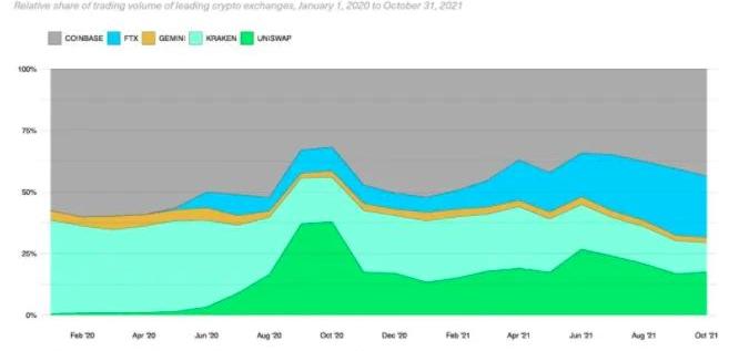 网络参与者能够通过资产对向DEX提供流动性,以换取产生的掉期费和流动性提供者奖励。DEX类似于经纪账户或纽约证券交易所,不同之处在于它们由自动执行的智能合约运行。如今,Uniswap是建立在以太坊之上的最大DEX之一,其交易量可与FTX和Coinbase等中心化加密交易所相媲美。