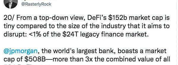 Bitwise研究分析师RyanRassmusan在推特上发帖称:“摩根大通是世界上最大的银行,其市值约为5080亿美元,是所有DeFi应用程序总和的3倍多。与其旨在颠覆的行业规模相比,DeFi微不足道:24美元传统金融市场的1%。”