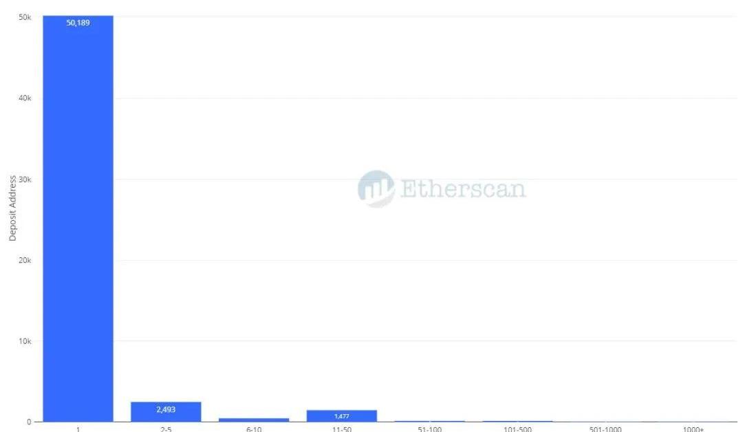 从Eth2存款仪表板的图表。另一个需要分析的视图是信标链上有多个验证者的以太坊地址的数量。在总共55,000个地址中,有50,189个(91%)地址只有一个与之关联的验证者,而44个(0.1%)地址有超过1,000个验证者。