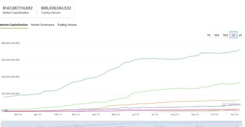 Glassnode数据显示,截至11月7日,两大美元稳定币USDT、USDC的供应量创下历史新高,USDT的循环应用量超721.86亿美元,USDC的循环供应量超342.91亿美元。市值最高和次高的两大美元稳定币也抬升了整个稳定币市场的规模,背后是近期比特币领导的加密资产市场总市值的扩大。Coingecko收录的数据显示,当前,加密资产总市值已经超过了3万亿美元,而与美元、欧元、英镑等国际主流法定货币挂钩的稳定币总市值则超过了1429亿美元。美元稳定币仍旧占据稳定币市场的主导地位,该市场进一步扩大前的一周,即11月1日,美国财政部刚刚领导有关机构发布了《稳定币报告》,该报告总结了稳定币及其相关活动带来的系统性风险,并敦促美国国会尽快立法,制定全面的稳定币监管框架,以确保支付型的稳定币发行商能像银行那样受到监管。这份报告的出炉并未在加密行业引发较大反弹,相应的,稳定币市值反而随着加密资产市场的又一次活跃而扩大。行业人士认为,这或因该报告内容并未强调监管稳定币的具体机构,而是将方向指向了更为长久的道路:国会立法。3万亿美元加密资产市值推涨稳定币规模