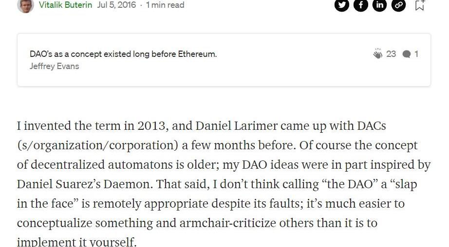 DAO,英文为DecentralizedAutonomousOrganization,即去中心化自治组织,是一个由计算机程序编码的规则代表的组织,这些规则是透明的,由组织成员控制,不受中心化组织的影响,并且DAO的金融交易记录和程序规则在区块链上维护。虽然分布式和自治在过去的历史中也有许多研究结果,比如许多人认为去中心化组织是由美国作家奥里·布莱福曼2006年在一本名为《海星和蜘蛛》的书中提出来的,他在书中把中心化组织比喻为蜘蛛,把去中心化组织比喻为海星,并详细的阐释了两者的不同特点和区别。但是在这里我们主要还是讨论基于区块链技术所提出去中心化自治组织。关于DAO的概念,最初DanLarimer于2013年提出了去中心化自治公司这一术语,但DAO的概念是被VitalikButerin汲取了DanLarimer的概念后并将其归纳,创造了去中心化自治组织一词。但是据V神说,这一概念部分受启发于DanielSuarez的小说《守护程序》。