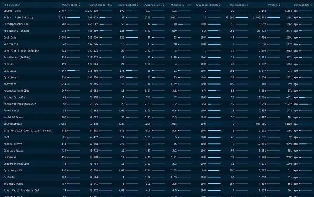 NFT的疯狂价格变动一直是许多人兴奋和炒作的原因。以下部分是我们对NFT估值的看法。要问的第一个合乎逻辑的问题是NFT是否创造了稀缺性。Nansen市场领先的NFT追踪器显示,目前在Opensea上,有1288个独立的ETH系列,其中700个是在过去一个月中创建的,仅在过去一周就有200个。这甚至不包括Solana等其他链上的NFT。在每个系列中,流通的NFT数量可以从通常的几千个到高达200万或甚至700万不等。供应量完全取决于项目原始设计者的决定,而制造的稀缺性是许多NFT项目中众所周知的特征。在过去的3个月里,NFT的数量呈指数级增长,这确实表明,在加密货币中创造无限的“可投资资产”并开始即时交易的速度是没有限制的。在过去,任何收藏品,例如棒球交易卡,在进入非常不透明的二级市场之前,都会有一个完整的生产/分销周期来导航。在,对于任何NFT来说,在几秒钟内就会有一次初级拍卖,然后是二级交易——所有这些,包括每笔交易和实时订单在区块链上都是完全透明的。虽然大部分藏品毫无价值,但所有OpenseaETHNFT的总市值总计为580万ETH。其中仅前30个收藏品就占460万个ETH,价值157亿美元。这些CryptoArtNFT之所以可以无限增加,是因为它非常简单——通过随机化几个基本属性的组合,用基本算法可以产生任何数量的外观特征。Cryptopunks是类似于BTC的NFT先行者,也许值得现在为它们支付平均123ETH的价格。事实上,它的价值到目前为止比任何其他收藏品都要保持得好。BoredApe系列也是值得注意的,在苏富比拍卖会上,107幅作品以2440万美元的价格售出,获得了更大艺术界的认可。当然,还有成功的区块链游戏AxieInfinity。许多分析师试图通过统计数据来确定创作的最终价值,例如发布日期或艺术家,但所有这些都没有显示出什么相关性,并强化了这一切可能只是随机的看法。不可否认的是,人气和社区是藏品价格上涨的驱动因素,而这一切都归结为文化和地位的吸引力。许多曾经匿名的收藏家公开亮相以展示他们的在线收藏。