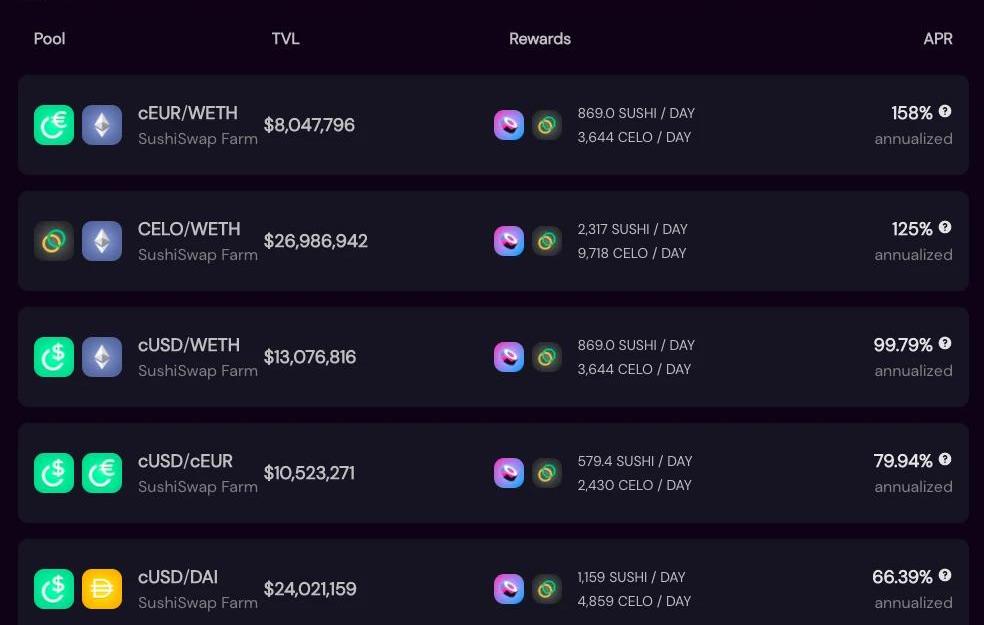 Celo是我作为用户非常喜欢的一条新兴公链。Celo与其他公链之间最大的差异是其主打的「去中心化移动支付」概念,这其中很重要的一部分是在移动端设备上实现并推广DeFi应用。八月末,Celo正式官宣了「DeFiforthePeople」计划,拟提供超过1亿美元的资金用于宣传、资助和激励措施,推进生态体系建设。在该计划的首批合作伙伴中,我们能看到Aave、Curve、Sushiswap、0x、UMA等多款龙头DeFi应用的身影。10月14日,SushiSwap已依托该计划于Celo上启动了1260万美元的流动性挖矿奖励,当前稳定币对的收益相当可观,截至10月23日晚间,年化数据可达60%+。