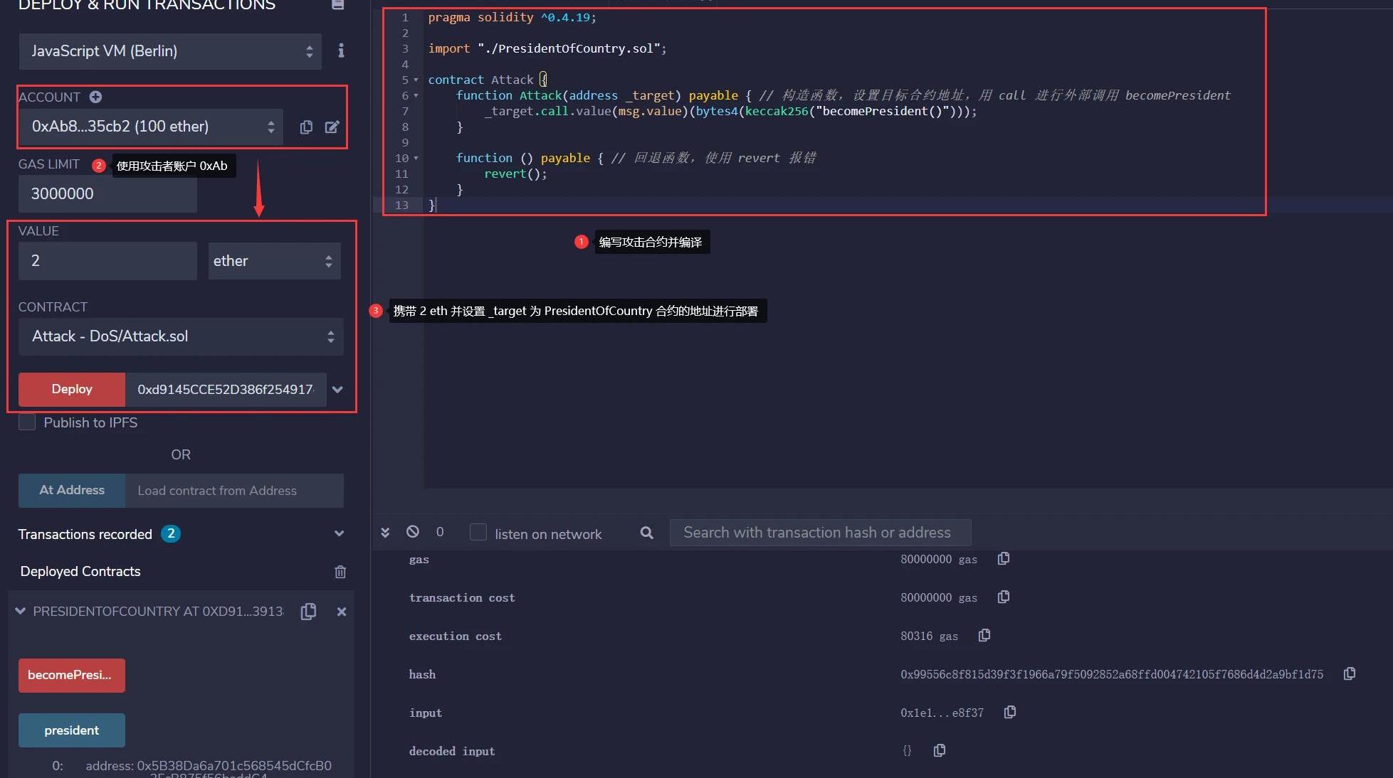此时有一个攻击者(0xAb8483F64d9C6d1EcF9b849Ae677dD3315835cb2)编写了一个攻击者合约Attack.sol,携带2eth并设置_target为PresidentOfCountry合约地址(0xd9145CCE52D386f254917e481eB44e9943F39138)进行部署。