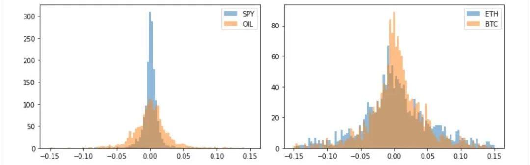 在上表中,我们展示了各种资产两年的Hurst价格,不出所料,比特币成为了最自相关的资产。股票相对均值回归,而石油和比特币在这些时间段内显示出持续趋势的可能性更高。Hurst指数当然没有显示出全部情况,因为它没有量化趋势的幅度——所以如果一项资产每天只上涨1个基点,但是每一天它都会上涨,你会发现它的Hurst指数非常高,这对于交易资产很有用,但对了解趋势的大小没有帮助。可视化回报大小的最简单方法是通过直方图,直方图越平坦,资产的平均变动就越大。