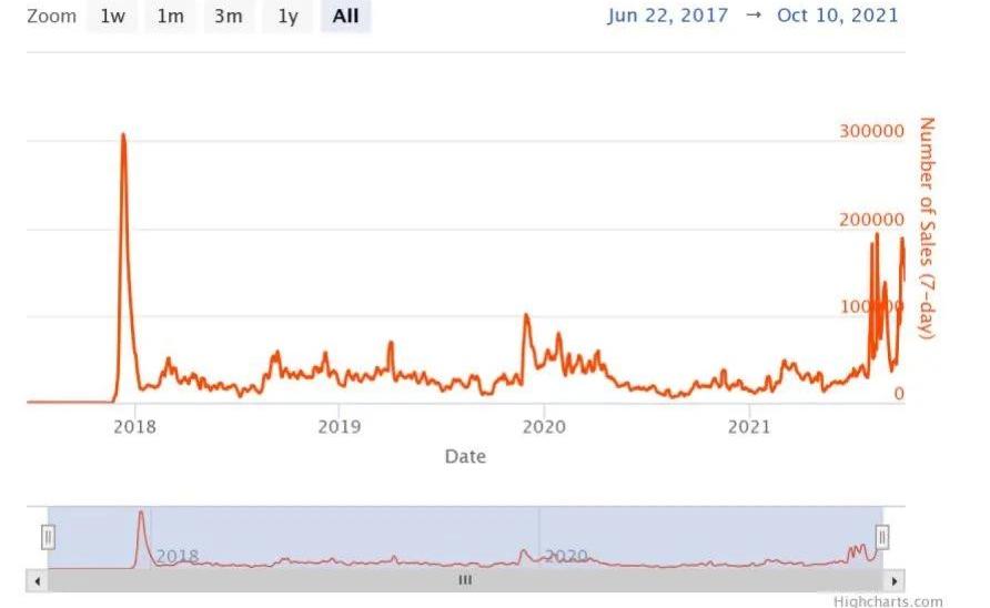 NFT,即Non-FungibleToken,中文名为非同质化通证。“通证”即通过区块链技术,为照片、视频、音频和其他类型的数字文件建立经过验证的被公开证明的所有权。“非同质化”使得这种数字资产缺乏互换性,能够为其提供唯一性的证明。原本无限可复制的数字世界至此通过NFT形成了有“价值”的数字资产。它不等同于虚拟货币,也不等同于区块链,而是在区块链之上的一种新技术。通过探索实物资产与数字技术结合的可能性,NFT开启了一种全新的数字世界。在这个数字世界中,NFT承载了IP过去未实现的价值:“唯一性确权”解决了数字资产确权、收藏、交易等问题;“智能合约技术”帮助创作者分享后续增值收益,成为文化产业创新发展的加速器。如区块链技术的政策环境和发展背景一致,NFT形成了以“联盟链”为主的国内市场和“公链”为主的国外市场。公链属于开放性网络,任何人在任何地方都可以参与共识,而“代币机制”就是公链最本质的特征。以太坊、Flow等公链,成为海外NFT的技术主流,但无准入门槛、无实名、无风险管控机制的公链系统为一些人留下可乘之机。据Nonfungible的数据,2018年和2021年两个时期的NFT市场有较大的差别。今年的交易数量并未突破2018年的峰值,但交易额最高却增长了10亿倍。相较之下,目前NFT市场的生产力和生产关系是不相适应的。生产力在狭义上指再生生产力,即人类创造新财富的能力。但目前,NFT一级发行市场稍显疲软,高质量的作品有限,而参与发行的创作者门槛越来越低。NFT作品的质与量上未能展现符合这个爆发增长时期应有的活力。生产关系是指人们在再生产过程中结成的相互关系,包括生产、分配交换和消费等方面生产关系。NFT两级市场的对比下,以逐利为特征的生产关系更加明显。二级市场呈现疯狂增长的态势,这透露了目前参与者的心态,即通过换手获利,而非立足于IP价值本身。NFT交易数量和交易金额
