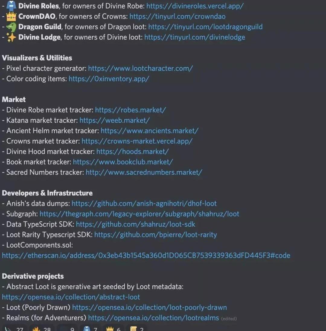 Rarity高效的推进速度,一定程度上也要归功于AC本人及其背后Fantom团队的积极运营。AC创建原始合约后,在代码库中不定时更新物品、铸造装备等游戏的核心模块代码。9月13日,AC还在博客宣布为Rarity的生态建设者提供最高10万美元的赏金,奖励事项包括扩展Rarity内容、UI开发、将Rarity集成至另一游戏,以及基于Rarity开发完整游戏。除把控游戏核心代码设计外,AC本人也会对社区创建的衍生项目有所筛选。Rarity的活跃开发者Rahim向「链捕手」介绍,AC会视新项目是否符合Rarity之后更大的愿景,如果AC「承认」一个新项目,他会在推特转发该项目,并把其写入他的Github中。而有「割韭菜」嫌疑的新项目则得不到AC的认可,如部分新项目还未上线前端,就需要玩家付费购买物件。9月下旬,一个名为「RAR」的模块项目此前向部分玩家发布空投,但其领取有2100万的上限,Rahim称这实际上违背了Rarity成为「无限制的游戏世界」的愿景。Dscord历史记录显示,9月21日,AC本人在公共频道中宣布,之后任何聊到RAR相关的话题,都会被封禁或禁言。事实上,除理念原创与否外,协作方式的不同正是Loot和Rarity的重要区别。Loot创始人Dom自项目发布时就宣称这是一场「实验」,人们可以利用Loot做任何想做的事情。Dom在接受科技专栏作者CaseyNewton采访时也表示,自己将会作为「justanotherbuilder」,寻找迭代和扩展Loot的新方法。据链捕手观察,Dom本人在LootDiscord社区中会不时上线答复、讨论技术问题,或提出自己的解决方案建议。LootDiscord社区的衍生项目汇总栏中,管理员也提示:「没有’官方’衍生品一说——这暗示了Loot的原始团队有所参与。相反,这些都是由社区创建、社区运营的。」