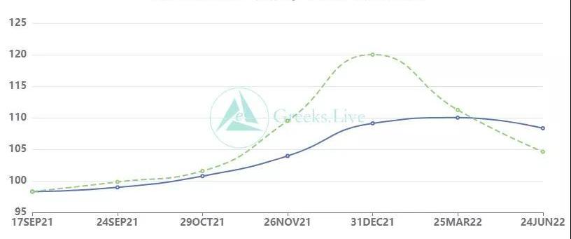 播报数据由Greeks.liveDataLab格致数据实验室和Deribit官网提供。市场对于本轮下跌反应寥寥,跌势放缓,主要期限IV均出现下降,甚至多个期限IV低于下跌之前。超短期期权成交量明显下降,买方热情不高,市场观望情绪浓厚。比特币昨日结算价45303美元,Reddit粉丝币价比73,七日粉丝复利年化增速44%以太坊昨日结算价3306美元,Reddit粉丝币价比313,七日粉丝复利年化增速39%以上参数为个人观察市场热度使用的指标,详细内容可以参见之前的文章《币的估值指标:Reddit粉丝币价比》期权持仓量17.7万张,价值81亿美元,期权成交量1.8万张。10d83%30d71%90d73%1Y79%各标准化期限隐含波动率:今日:1m84%,3m90%,6m94%,DVol93%9/8:1m86%,3m92%,6m96%,DVol95%比特币跌势缓解,在46000美元附近振荡,但是震荡中枢在不断下降,市场还没有到说止跌的时候,目前报收45700美元。RV从50%上涨至63%,中短期看跌期权的IV上涨明显,但IV整体比较稳定,中远期IV相比前几日甚至略有下降。