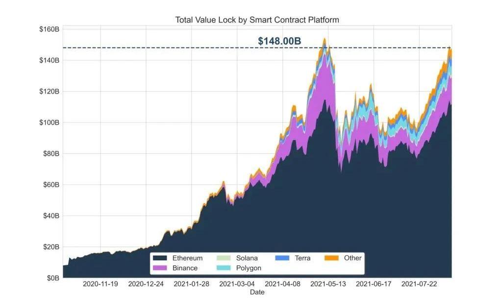 首先,TVL并不是衡量DeFi协议采用度的完美衡量标准,但它确实显示了人们对这个智能合约的重视程度。1480亿美元,这么大的资金量可不是开玩笑。这个数字的继续增加表明投资者将自己财富委托给“计算机代码”的放心度增加。首先,在这段DeFi复苏期间,Ethereum、Terra、Solana和Fantom毫无疑问是支撑反弹的中坚力量,它们都接近或已经创造了TVL新纪录。1.以太坊——TVL1160亿美元