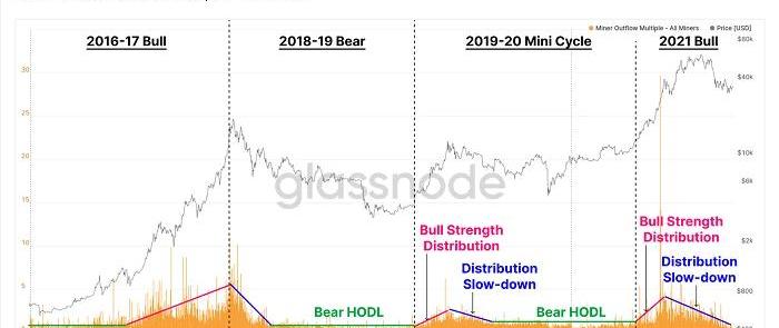 上图:每日矿工收入实时图表矿工流出倍数是一个追踪的矿工支出指标,通过分析发现,即便在大量矿机下线时,矿工最近并没有大幅抛售他们的比特币。实际上,我们可以从矿工支出行为中看到一丝“周期性”端倪:1、熊市中持有,矿工流出倍数走势平坦,这意味着矿工在稳定地分销比特币,既不快也不慢;2、牛市中分销,矿工流出倍数走势上升,这意味着矿工利用牛市的力量加速抛售比特币;3、市场见顶后抛售减少,矿工流出倍数走势下降,这意味着矿工支出放缓,或者他们更希望限制市场出现过度的抛售压力。令人印象深刻的是,即便在全网算力暴跌时期,市场也没有看到矿工抛售行为出现显著增加。另一方面,比特币全网算力恢复的速度也可用于评估矿工的抛售行为,简单来说——1、如果算力市场出现快速复苏,意味着比特币矿工大规模抛售BTC的风险将会降低,因为矿工迅速找到了新的场地来重建自己的挖矿业务、销售硬件、或是利用其他渠道来支付他们的运营成本,这可能会让比特币有一定的回升空间并回到之前高点。2、如果算力市场的恢复时间较长,意味着比特币矿工承担的成本或债务增加,继而为矿工抛售比特币创造了更高可能性,他们可能不得不抛售他们的持有的比特币,这样才能获得更多法定货币用于支付他们的运营成本。