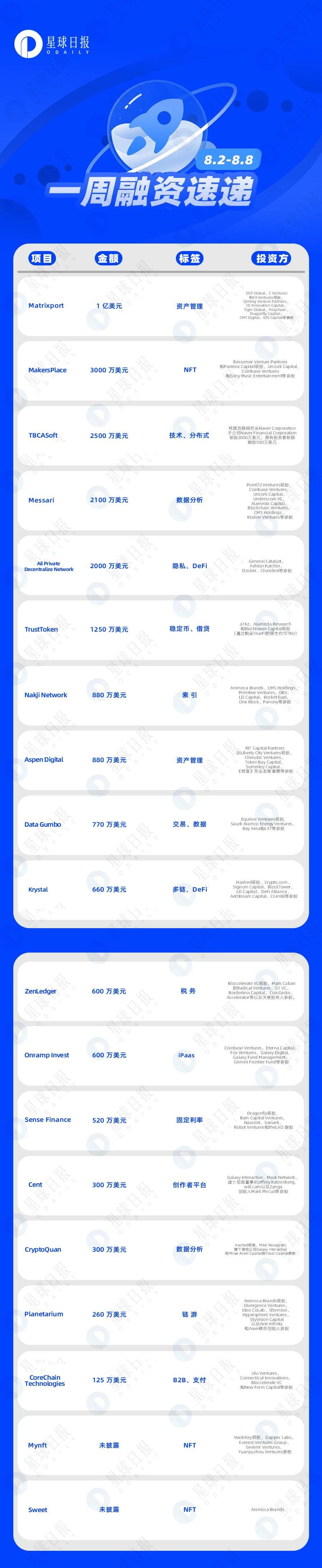 以下为具体融资事件:Matrixport以超过10亿美元投前估值完成1亿美元融资加密金融服务平台Matrixport在周日晚间宣布,以超过10亿美元的投前估值完成1亿美元C轮融资,DSTGlobal、CVentures和K3Ventures领投,QimingVenturePartners、CEInnovationCapital、TigerGlobal、CachetGroup、PalmDriveCapital、ForesightVentures、A&TCapital、Lightspeed、Polychain、DragonflyCapital、CMTDigital、IDGCapital等参投。据一位发言人透露,Matrixport迄今已融资1.29亿美元。Matrixport于2019年从Bitmain分拆出来,是亚洲大型加密货币公司,管理约100亿美元资产。其平台提供的服务包括交易、借贷和类似固定收益的产品。NFT市场MakersPlace宣布完成3000万美元A轮融资,BessemerVenturePartners和PanteraCapital领投NFT市场MakersPlace宣布完成3000万美元A轮融资,BessemerVenturePartners和PanteraCapital领投,UncorkCapital、CoinbaseVentures和SonyMusicEntertainment等参投。MakersPlace计划利用现金流入来壮大其团队并继续扩大其市场。区块链技术公司TBCASoft融资2500万美元,NaverFinancial领投、软银参投区块链技术公司TBCASoft宣布初步完成2500万美元B轮融资,韩国互联网巨头NaverCorporation子公司NaverFinancialCorporation领投2000万美元,原有投资者软银跟投500万美元。此轮融资后NaverFinancial成为仅次于软银的第二大机构投资者。TBCASoft会将这笔资金用于扩张其支付网络HIVEX,首先在日本、韩国和中国等东北亚地区推出,然后扩张至东南亚。同时该公司将招募更多人才,推动更多创新。HIVEX是一个利用分布式账本技术的跨运营商区块链支付网络。交易数据可实现即时高效协调,无单点故障,可降低欺诈风险。HIVEX专为基于二维码的移动支付设计,可打通不同闭环的移动支付服务提供商的用户和商家。消费者能使用自己的移动应用程序在世界各地任何有HIVEX接受标志的商家处进行二维码支付。区块链数据提供商Messari完成2100万美元A轮融资,Point72Ventures领投区块链数据提供商Messari宣布完成2100万美元A轮融资,对冲基金亿万富翁StevenCohen的Point72Ventures领投,此次为Point72Ventures首次对加密领域进行投资。CoinbaseVentures、UncorkCapital、UnderscoreVC、AlamedaCapital、BlockchainVentures、CMSHoldings、GeminiFrontierFund、WinklevossCapital、KrakenVentures、前汤森路透首席执行官TomGlocer和Anchorage联合创始人DiogoMonica参投。Point72Ventures运营合伙人AdamCarson已加入Messari的董事会。Messari将利用这笔资金将其工程和研究人员人数增加两倍,扩大其市场数据平台并推出新的代币治理工具。宣布完成2000万美元融资,GeneralCatalyst等参投星球日报讯官方消息,AilPrivateDecentralizeNetwork宣布完成2000万美元融资,GeneralCatalyst、AshtonKutcher、Docker、Chainlink等参投。一家投资公司的神秘合伙人即将加入APDT董事会。AilPrivateDecentralizeNetwork正在打造一条足够去中心化的隐私互联网连接交互数据,其区块链互联网是非许可链。旨在借助基于隐私分布式互联网的智能合约取代传统金融范围中的特权机构,并且提高整个现有DeFi金融体系的运行效率。TrustToken融资1250万美元,a16z、AlamedaResearch和BlocktowerCapital领投DeFi借贷协议TrueFi和稳定币TUSD的运营商TrustToken完成1250万美元的新一轮融资,AndreessenHorowitz、AlamedaResearch和BlocktowerCapital领投。TrustToken表示,将利用该笔资金扩大其团队和TrueFi的运营。据了解,TrueFi根据从链上和链下数据得出的信用评分来决定贷款,而不是抵押资产。据该公司称,自2020年11月以来,该协议已经发放了超过2亿美元的贷款,并向贷款人支付了170万美元,没有任何违约。索引协议NakjiNetwork完成880万美元私募融资,AnimocaBrands、LDCapital等参投官方消息,用于区块链数据的索引协议NakjiNetwork宣布完成880万美元私募融资,AnimocaBrands、CMSHoldings、PrimitiveVentures、GBV、LDCapital、RocketFuel、OneBlock、Panony等参投。这一轮融资将允许Nakji进一步投资于开发其信息中继协议,该协议将在大量区块链之间连接到链外世界,同时为今年晚些时候的公开发布做好准备。据悉,Nakji由AllieZhang和DavidKim共同创立,AllieZhang曾是实时数据智能初创公司Bottlenose的首席工程师,DavidKim曾是普华永道和德勤的13年技术和管理顾问。David和Allie拥有数十年的区块链和大数据孵化、构建和咨询经验。2016年,David还帮助普华永道建立了首批四大区块链业务之一。Nakji帮助将信息从传统区块链传递到任何可以接收链上数据点的链外受体,同时提供了额外的安全层,以确保传输数据的安全性和准确性。加密投资平台AspenDigital融资880万美元,RITCapitalPartners等领投加密投资平台AspenDigital周三宣布完成880万美元Pre-A轮融资,雅各布·罗斯柴尔德创立的投资信托RITCapitalPartners及区块链早期风投公司LibertyCityVentures领投,CherubicVentures、TokenBayCapital、SomerleyCapital、《财富》杂志老板谢展和ChavalJiaravanon等参投。此轮融资资金将用于在中国香港、伦敦和新加坡的团队扩张和市场拓展,瞄准亚洲、欧洲和中东的客户。区块链初创公司DataGumbo完成770万美元B轮融资,EquinorVentures领投星球日报讯区块链初创公司DataGumbo完成770万美元B轮融资,EquinorVentures领投,SaudiAramcoEnergyVentures、BayArea和L37等参投。多链DeFi管理平台Krystal完成660万美元种子轮融资,Hashed、LDCapital、ArkStreamCapital等参投星球日报讯官方消息,多链DeFi管理平台Krystal完成660万美元种子轮融资,Hashed领投,Crypto.com、SignumCapital、BlockTower、HyperChain、ArringtonCapital、LDCapital、DeFiAlliance、ArkStreamCapital
