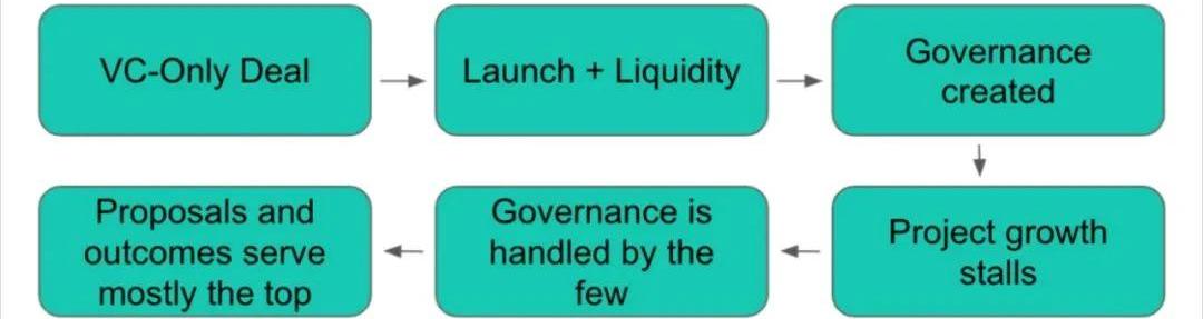 寡头和贵族的治理形式似乎是原始政府最常见的自然形式之一。平民应该将他们的声音转移给精英和知识渊博的人的想法在任何社会中都是一个有吸引力的想法,但很少会为大多数人带来更好的结果。DeFi也不例外。与任何新领域一样,早期的DeFi大部分都是由希望支持新形式金融技术的风险投资家发起的。但伴随着DeFi的成长和发展,出现了一些关于协议真正去中心化的结构性问题,主要是因为它们无法进行连贯的治理,最终不会像卡特尔一样运作。在DeFi中,治理通常以投票方式进行,提案必须达到一定的投票门槛才能通过。这些投票通常由代币所有权分配。一个实体持有的代币越多,它拥有的选票就越多,从而有更强的影响力。在纸面上,这似乎是标准的民主。但这个简单的机制包含了DeFi治理萎靡不振的种子。代币和开发流程如下: