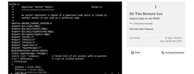 如今,蒂姆选择公开拍卖源代码的NFT,并非是一场迟到了三十年的敛财好戏,而是认为,NFT是万维网上“最新的有趣创作”,也是最合适的确定数字资产所有权的方式。现年66岁的蒂姆在一份声明中说:“30年前,我创造了一个东西,后来在全世界大量合作者的努力下,它已经成为人类的一个强大工具。对我来说,网络最好的一点是协作精神。虽然我不预测未来,但我真诚地希望它的使用、知识和潜力将保持开放,供我们所有人继续创新、创造和启动下一个技术变革,这是我们还无法想象的。无论是艺术品还是像这样的数字艺术品,NFT都是这个领域最新的改变游戏规则的创作,也是现有的最合适的所有权形式,这种形式是打包网络背后起源的理想方式。”苏富比将这份藏品宣传为“现在首款网络浏览器的唯一签名代码副本”,在定位上类似于出售名人手稿。