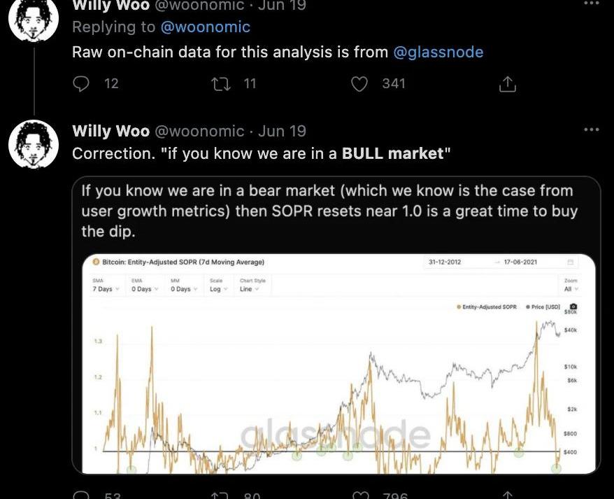 而量化分析师WillyWoo则直接甩出了数据称,根据Glassnode提供的已花费的输出利润率SOPR显示,比特币的的确确是进入了回调的时期,目前也是抄底的时候。SOPR指标是衡量比特币整体盈利或亏损的指标。比率为1表明,恐慌的人已经退出了市场,这意味着有明显的上行信号。这一指标表明,以低于当前比特币价格的价格出售可能意味着账面损失,因此很少有投资者愿意接受这种价格。