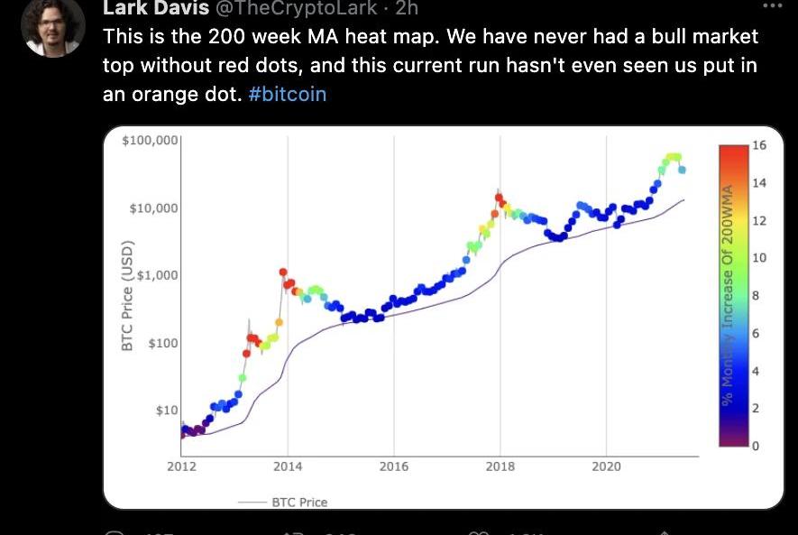 分析师LarkDavis也图文并茂的表示,从200周均线来看,市场绝对不会在没有达到下图热区的时候达到牛市顶峰。
