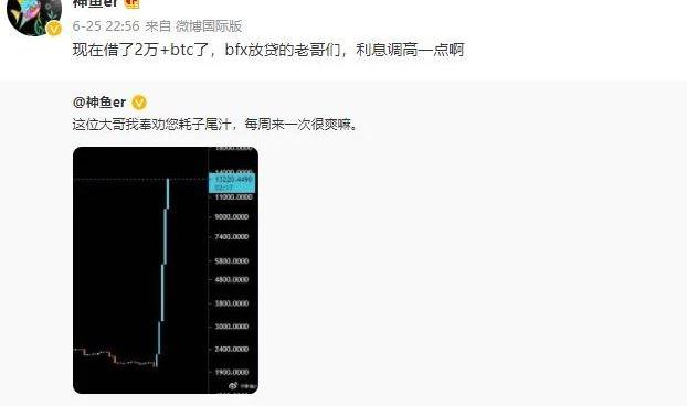 6月25日,有一条巨鲸引起了加密货币圈的关注。F2Pool联合创始人神鱼发微博表示,有一条加密巨鲸在25日借了2万多枚BTC做空市场。据悉,这是这条巨鲸第三次明牌操作,上周就曾在Bitfinex上借币超2.5万枚进行做空。