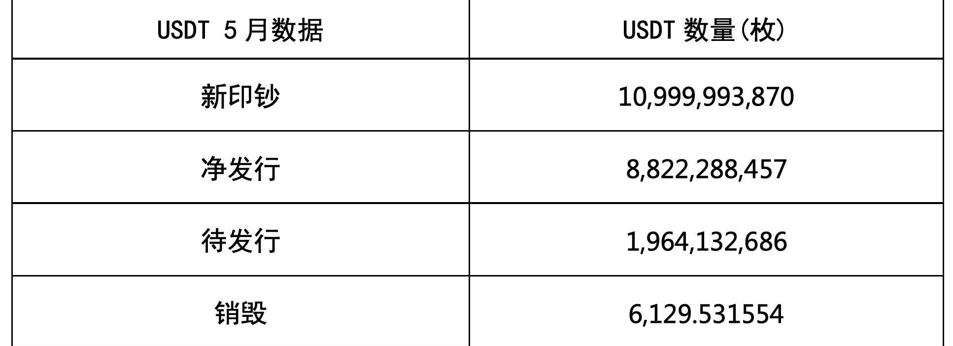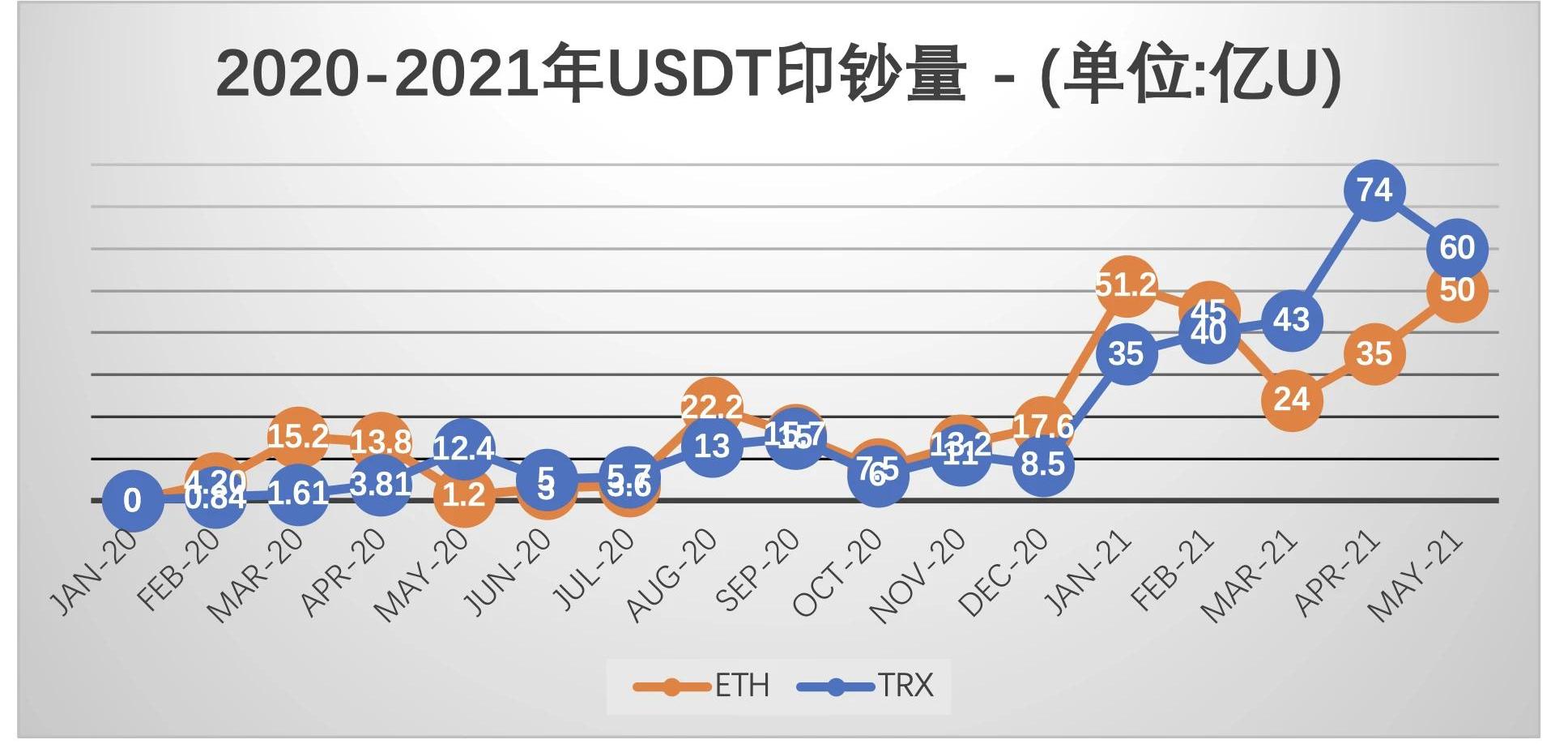 5月USDT净印钞共计110亿枚,其中ETH印钞50亿枚,TRX印钞60亿枚。