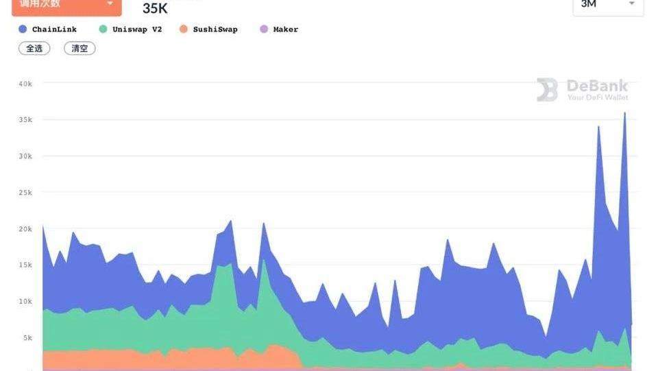 预言机代表着链上的DeFi等业务需要链下或价格数据的频率,所以在价格波动较大的期间,预言机被调用的次数也增长显著。虽然不是历史最高,但也能排进历史前三,单日被调用次数超过3.5万次。