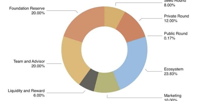Raydius代币可用于质押奖励、验证者奖励、交易费用、DAO等不同场景。以质押奖励为例,Raydius使用PoS共识和代币作为质押奖励的原生代币,代币设计可确保网络安全,因为对节点而言恶意行为的成本很高。桥接交易的验证者在生态中也会有奖励,此外,由于验证者需要保证金,担保抵押品也通过代币进行。对于建立在Raydius之上的应用程序及其用户,将根据网络使用情况收取交易费用。此外,当连接到其他二层协议时,也会收取交易费用。种子轮:8%私募轮:12%公募:0.17%生态系统:23.83%市场部分:10%基金预留:20%团队部分:20%流动性&收益:20%