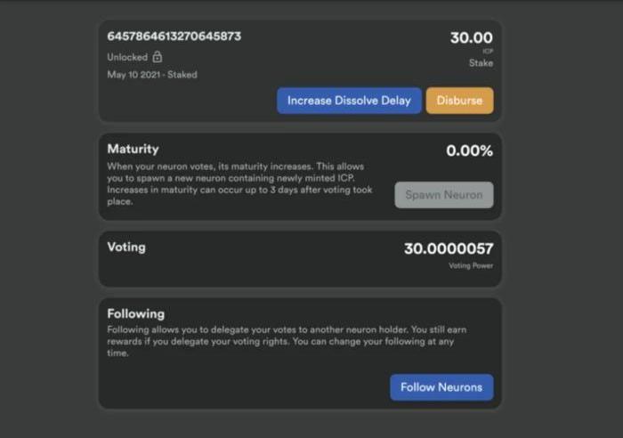 参与治理:用户可以创建和管理神经元,以参与网络治理并获得其他令牌。该页面显示的是“身份”,“ICP的锁定状态”,“创建时间”,“创建持续时间”的状态,这会增加锁定延迟或解锁ICP。以及神经元累积奖励的当前状态。