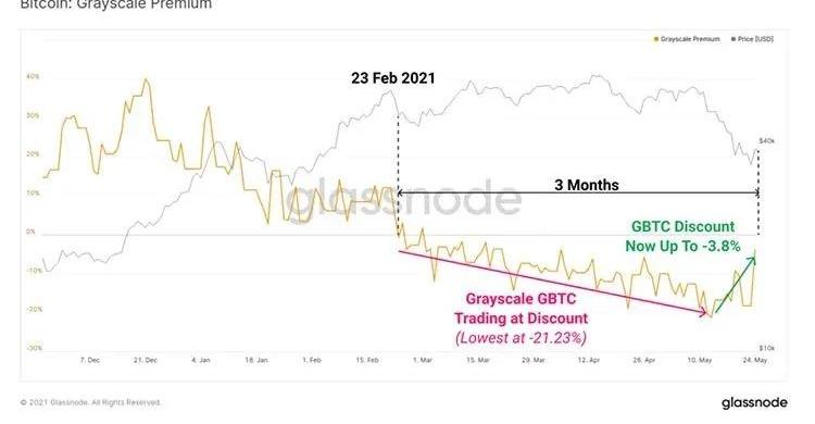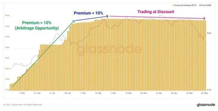 尽管如此,2月上半月的溢价跌至10%以下。GBTC开始以对现货定价的折价进行交易。同一时期,BTC/USD的现货价格从较低的30,000美元攀升至4月份的近65,000美元。到那时,GBTC的溢价已经翻到了负值。