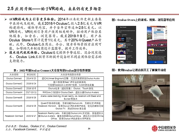 Facebook改名Meta,计划为元宇宙投资数十亿美元。扎克伯格计划到本十年末,让10亿人使用化身在虚拟和增强现实世界之间旅行,以进行工作、购物和休闲。微软宣布将打造元宇宙的商业应用,并推出虚实结合的视讯会议软件“Mesh for Microsoft Teams”。全球各大厂商纷纷入局“元宇宙”,VR头显和AR眼镜等硬件设备作为元宇宙的入口,预计将迎来发展良机,我们认为未来十年VR/AR将成为千亿级别巨大市场。
