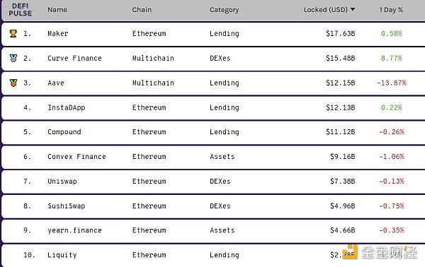 DeFi排名前十锁仓量 数据来源:DeFi Pluse