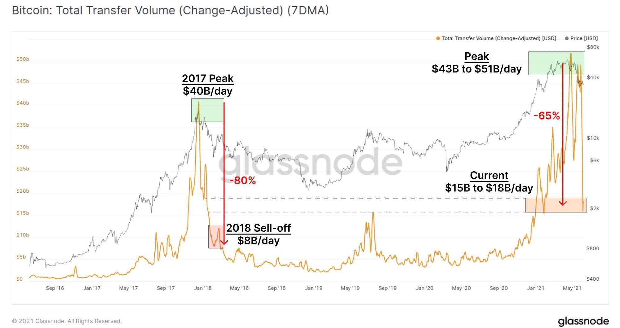 本文源自Glassnode链上周报"TheWeekOn-chain(Week23,2021)",由币世界研究院翻译、整理。译者:WinyHuang链上活动和价值结算急剧下跌,市场走向仍不明朗。