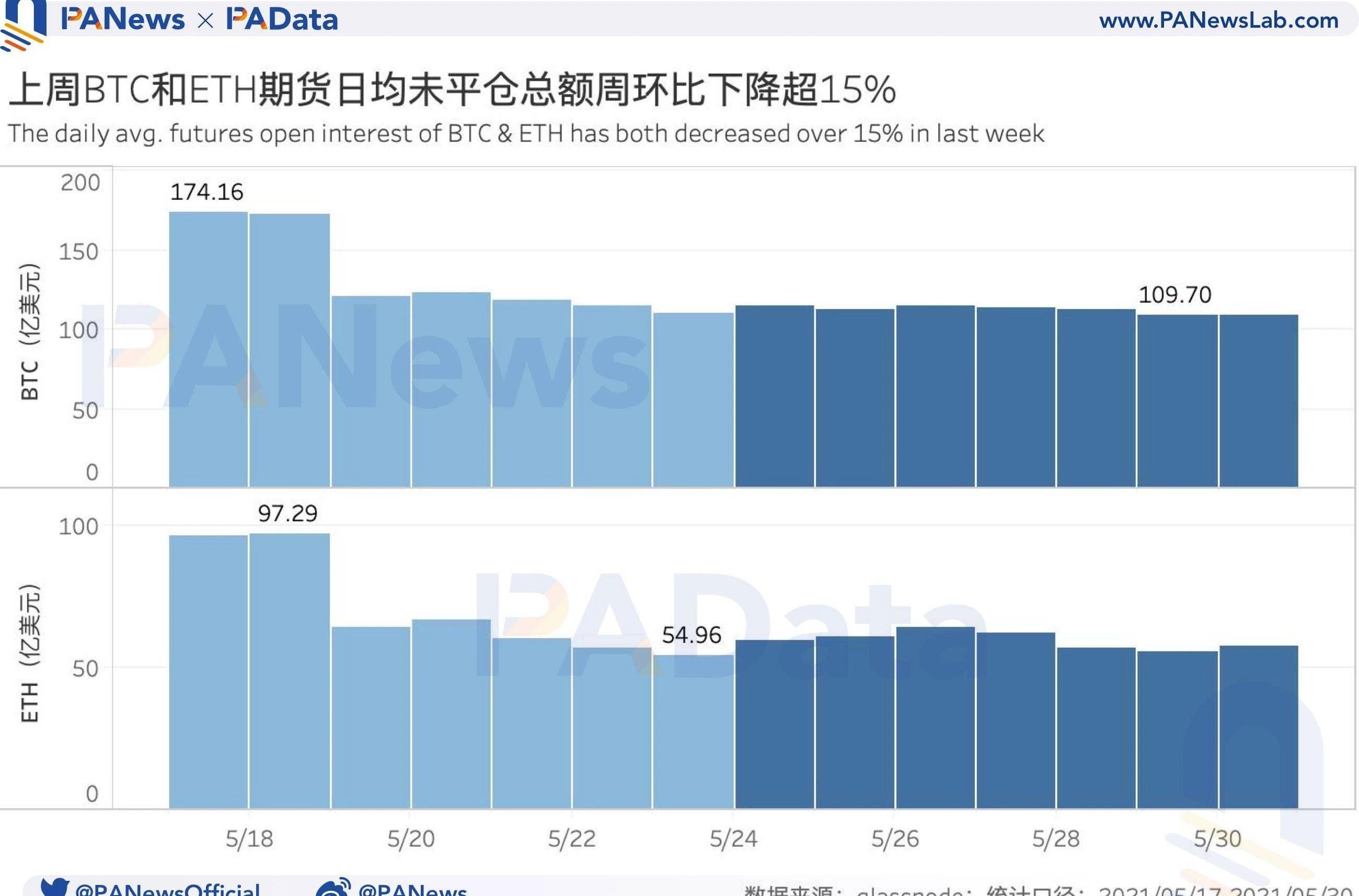 上周,BTC和ETH期货未平仓总额持续下降。BTC和ETH期货日均未平仓总额分别约为113.07亿美元和59.91亿美元,周环比分别下降约15.54%和15.98%,其中ETH期货的日均未平仓总额达到本月最低值,较本月最高单周日均值低了45%左右。另外,5月29日,BTC的单日期货未平仓总额约为109.70亿美元,创下5月的最低水平。