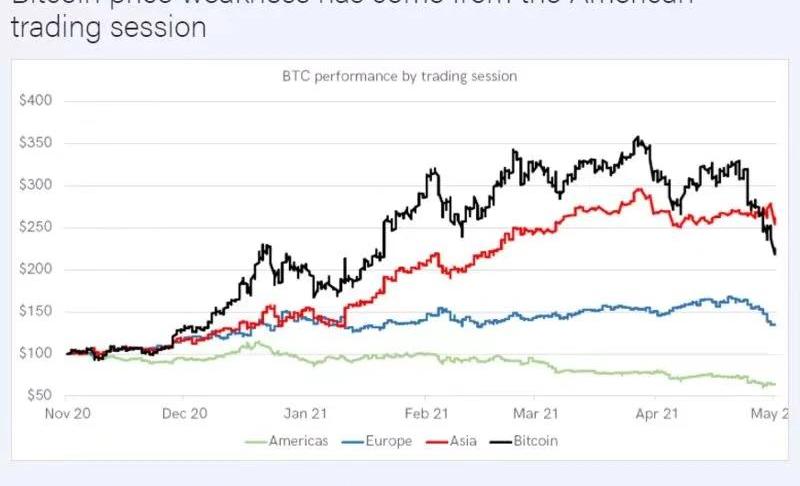 如果说Coinbase的公开上市是一个市场“信号”,预示比特币已经做好了迎接周期性暴跌的准备,但也没为最近的崩盘提供任何线索,而监管可以。比特币之所以能够拨动用户心弦,很大程度上是因为它是法币的替代品。就像黄金一样,它或许能够保值,而不受政府措施的影响。问题在于,政府法币既可以创造货币,也可以摧毁货币。各国政府在货币发行方面拥有垄断地位,且不愿意失去货币的主宰权。这是对比特币最严重的“看跌”点之一,比特币也在崩盘的几小时里获得很多新支持。中国也传出了支付和信用金融机构被禁止接受比特币的消息,而在美国,财政部新的货币监管专员,接替了特朗普政府从Coinbase招聘的人的位置后,宣布将对加密货币监管政策的审查。代理审计官员MichaelHsu表示审查并不是对加密货币宣战。他明确表示自己相信金融科技公司未来可期,但对于目前实行的宽松政策可能会改变的情况并不被比特币投资者所欢迎。然而,在中国对加密货币的新态度放出之后,市场开始出现极端抛售,这并非巧合。下图来自伦敦ByteTree资产管理公司的CharlieMorris,它将比特币交易模式划分为亚洲、欧洲和北美主导的交易时区。我们不清楚到底是谁在什么时候抛售,但这个交易时区可以帮助到我们: