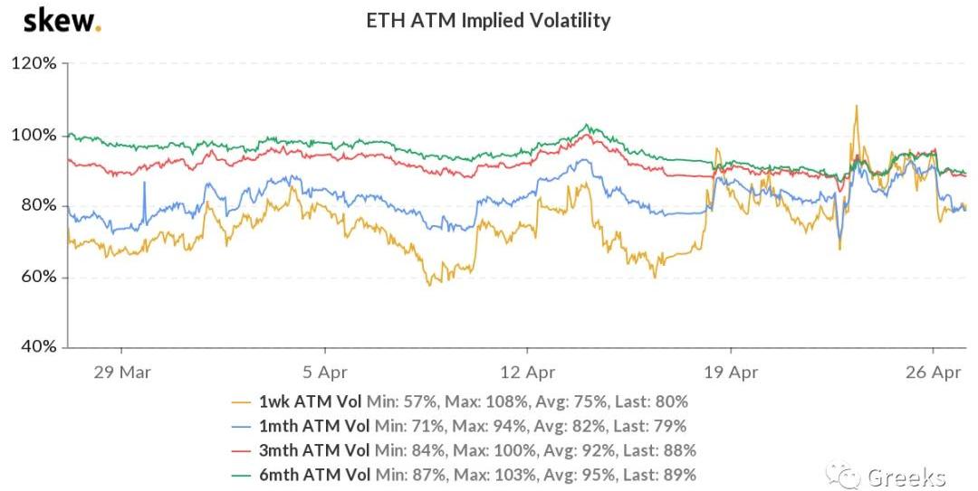 以太坊期权成交量3.05亿美元,持仓量41亿美元。10d98%30d89%90d93%1Y91%各标准化期限IV:今日:1m88%,3m94%,6m94%4/26:1m79%,3m88%,6m89%以太坊再临新高,现在已经和比特币拉开差距,最近Fei有利好消息,整个以太坊市场即将受到DeFi的冲击。