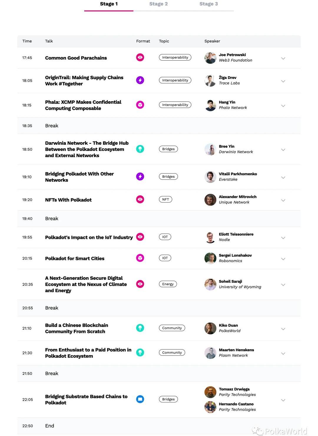 16:05-16:25是波卡生态纪录片《代码背后的波卡第2集-建设篇》的全球首映,悄悄透露一下,PolkaWorld团队也会出镜哦。这个纪录片的第一集我们之前有发过,可以回顾一下。16:25-18:25,主要由波卡的开发方Parity和运营方Web3基金会进行分享,演讲话题主要围绕着波卡、平行链、平行链拍卖等展开。相信听完这几个演讲,你会对波卡平行链有一个较为全面的认识。18:40-20:00,会由波卡社区的一些团队进行演讲,但目前具体的安排还未公布,会从社区的演讲中择优选拔。20:35-21:30,波卡创始人GavinWood博士会和大家闲聊一下,根据以往活动的经验,多多少少会提到一些从未公布过的东西,说不定还会有大惊喜呢,期待一下吧。21:40-22:40是社交HappyHour。这个环节我其实还挺期待的,一般来说线下活动的最后都会有这么个环节,大家可以留下来找你感兴趣的人聊几句,不过线上版我还真没见过,不知道具体会怎么玩,挺有趣的样子。5月20日