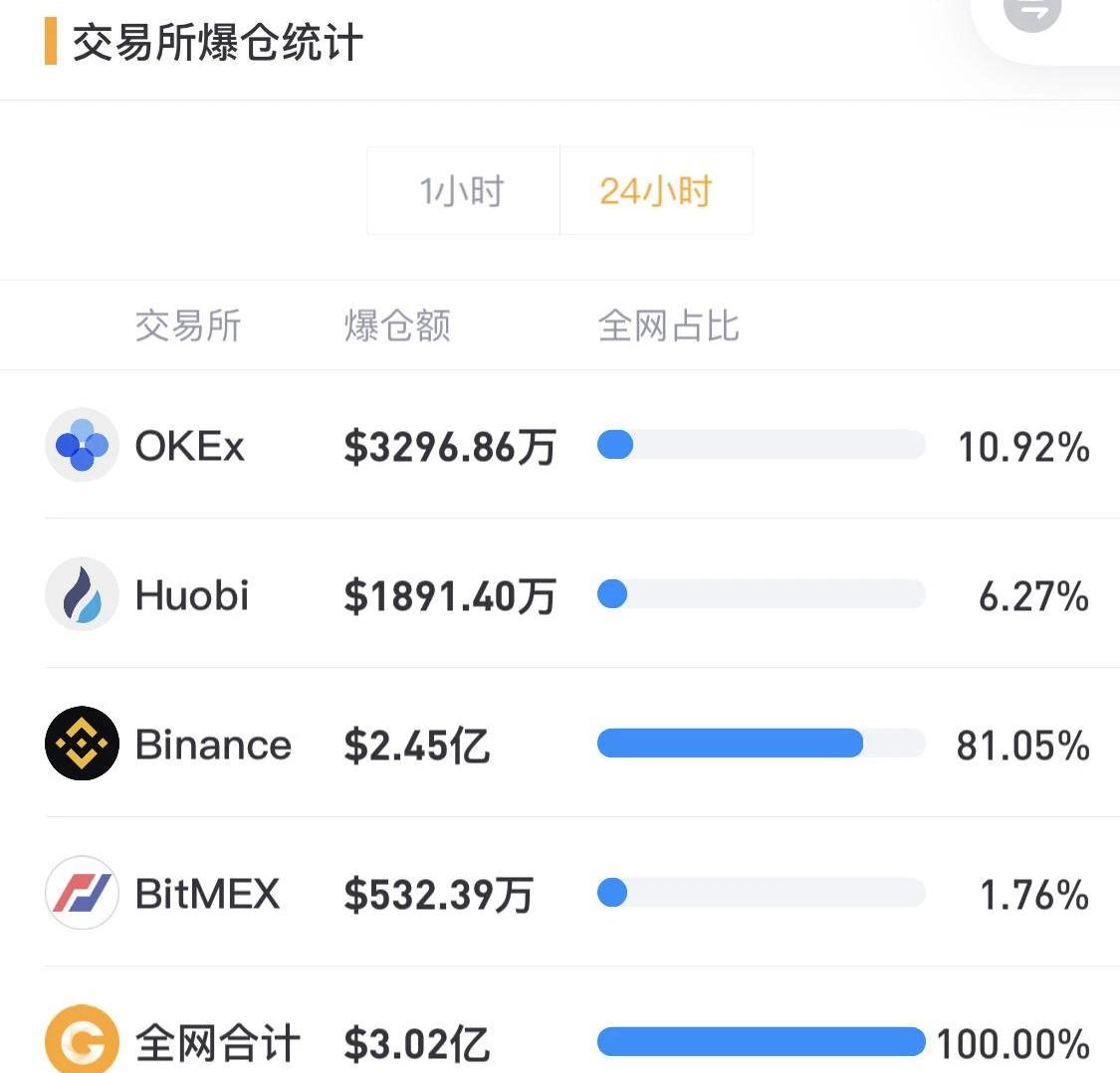 根据金果子的统计,过去24小时全网爆仓总额3.02亿美元。最大一笔爆仓单为BTC永续空头爆仓,价值184.12万美元,发生在Binance交易所。爆仓金额最高的合约交易所为Binance交易所,爆仓额达到2.45亿美元。