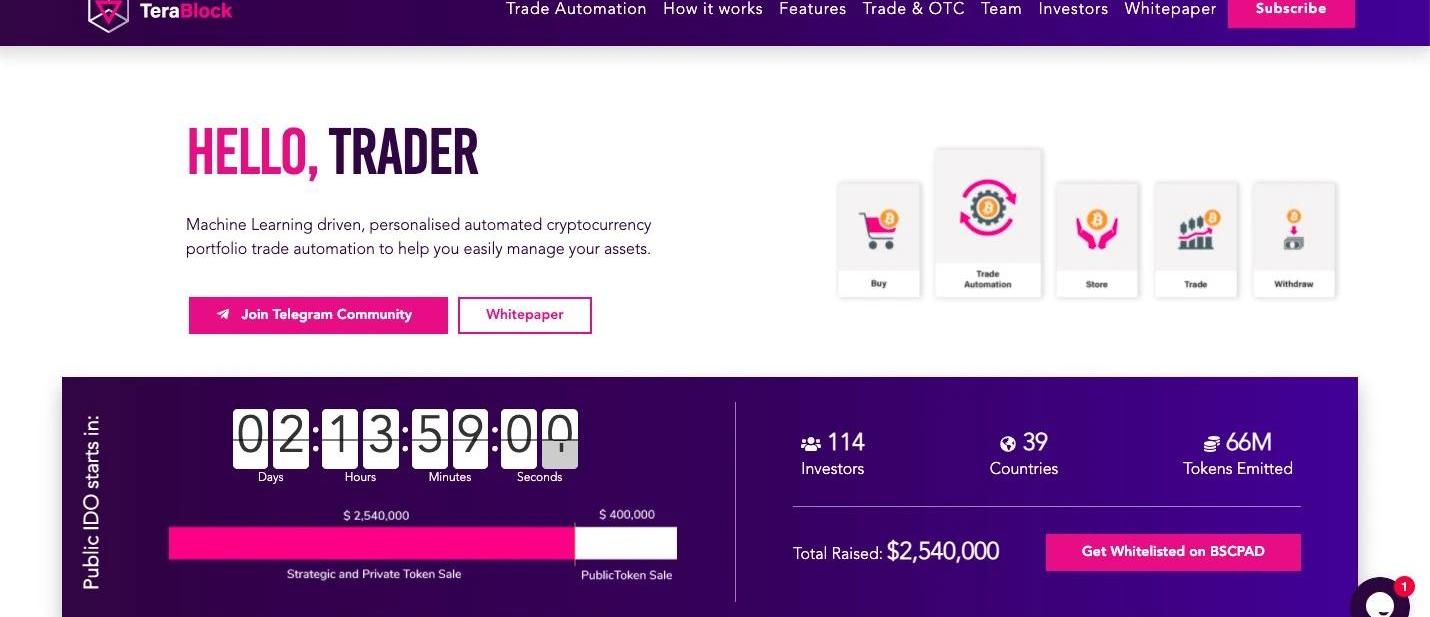 项目名:TeraBlock简介:TeraBlock是一个旨在通过机器学习驱动的自动化,来帮助新手加密货币交易者管理其投资组合的平台。该公司已经推出了一种全自动算法系统,在波动加剧的情况下,全自动算法系统将极大地帮助加密货币交易者简化交易策略。官网:https://terablock.ai/IDO详情:TeraBlock将于5月11日在BSCPad上进行IDO,出售代币TBC,单价0.05美元,募资规模25.4万美元。具体规则可点击下方链接查看:https://twitter.com/MyTeraBlock/status/1389585077751910402