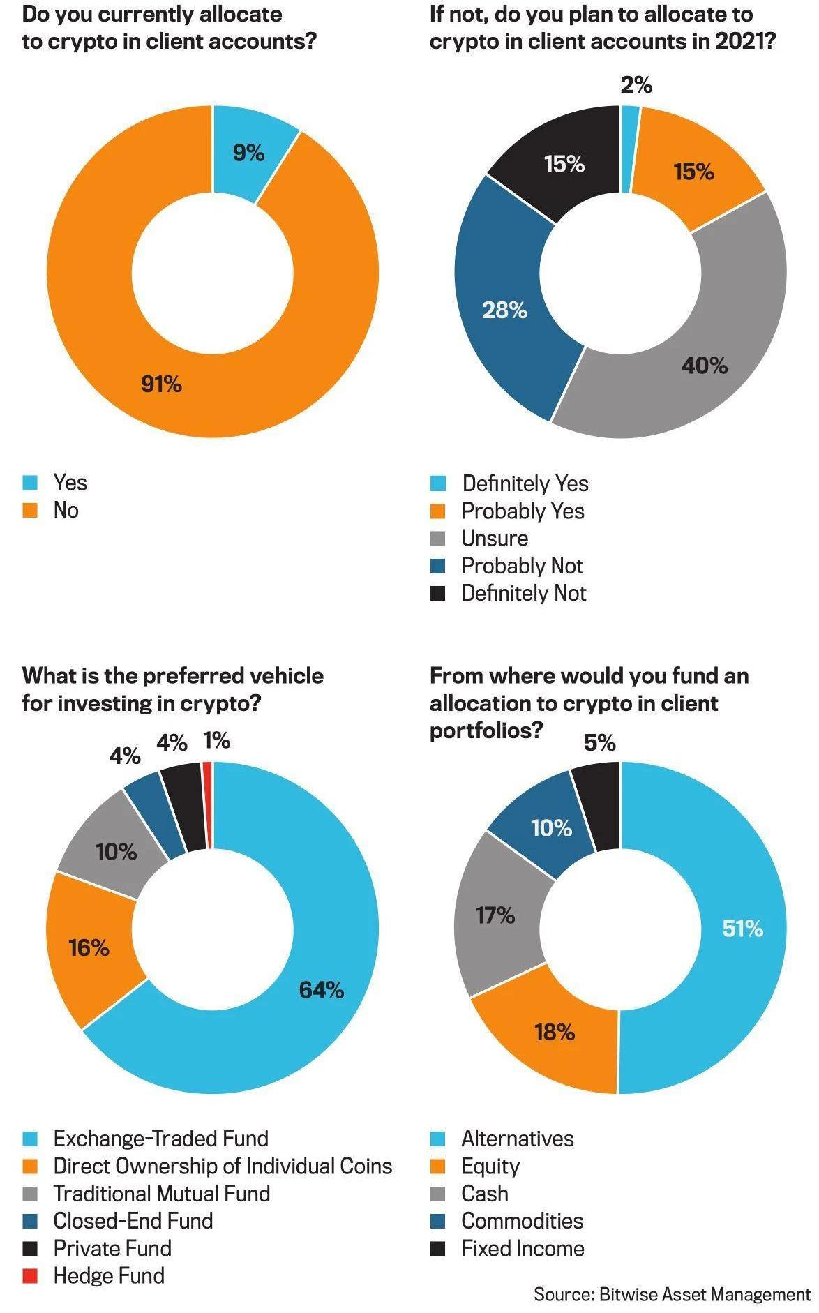 无论将它视作潮流或是局,人们现在越来越难轻视比特币,甚至一些长久以来持怀疑态度的人都不得不承认加密货币不会退出舞台。数字资产快速进入主流市场,财务顾问不断收到客户的问题,投资人想要更多地了解这个快速增长的资产类别。PaulTudorJones和StanleyDruckenmiller等知名投资人曾表示,自己在2020年将比特币纳入投资组合中,而富达投资和摩根士丹利等机构则在其平台上为顾问和理财客户提供了购买比特币的渠道。尽管市场热情高涨,但现在仍处于专业投资者接受加密货币的早期阶段。近日Bitwise资产管理的一篇调查显示:约9%的顾问所管理的客户投资组合中包括加密货币,而24%的顾问本人拥有加密资产。五分之四的顾问在2020年收到过客户关于加密资产的询问,其中17%计划在2021年通过客户投资组合进行投资。RIA是一家旨在为顾问提供区块链技术和虚拟货币教育资源的数字资产委员会,它的长期顾问兼负责人RicEdelman表示“我们正处于转折点。”“过去的几年中投资人的问题是‘为什么要投资比特币?’而现在问题已然变成‘为什么不投?’”Ric如是说。