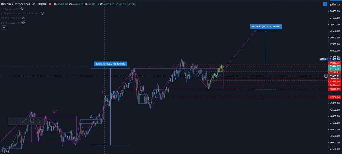 基本面方面,我们可以看到关于数字货币的利好不断,先是VISA支持以太坊上的USDC稳定币进行国际支付,接着又是paypal宣布,支持消费者使用数字货币在几百万商家里消费,数字货币正在破圈,从高台楼宇里走向市井小巷,被越来越多人熟知,被越来越多人接受,被越来越多人使用,这便是比特币的内在价值。链上数据证明,持有少于1个BTC的链上钱包数量占比正在增加,从过去3.97%增长到了5.2%,持有10-100个比特币的,减持56k比特币,持有100-1000个比特币的,增持331KBTC,持有1000-10K个比特币的,减持307KBTC,虽然有不少早期大户恐高症犯了,在减持比特币,但在增量市场里,抛售的比特币都将被承接住。技术面上,比特币在3月25日跌到5万美元最低点后,我们在短期的评级一直维持增持的评级,因为比特币已经构建了日线级别的中枢,目前正在走中枢的离开段,即主升浪,上一次比特币走日线级别中枢的主升浪的时候,比特币从29000美元涨到了58000美元,涨幅超过100%。如果这一次主升浪比特币突破前高,我们的短期目标价位是62000美金以上,请投资人持有自己的比特币,不要熬过曙光前的黑暗,在曙光初现时早早止盈,不要被短期的波动影响忘记了比特币长期的趋势,要记住我们始终提醒投资人,比特币的牛市仍在进行中。