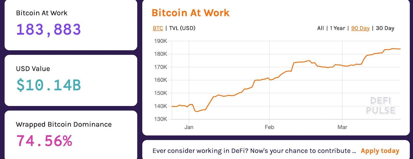随着DeFi的发展和火爆,如今发行在以太坊链上的比特币正在以相当可观的趋势增长。从下图可以看到,当前比特币锚定币的数量已超18万个,价值已超100亿美金。