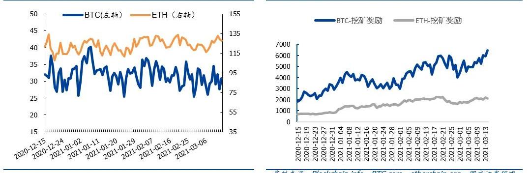 上周BTC日均算力达到156.3EH/s,环比上升1.7%;ETH全网日均算力达到433.4TH/s,环比上升2.5%。上周BTC全网挖矿难度为21.45T,环比下降0.9%;下次难度调整日在2021年3月19日,预计难度值为21.63T(+0.86%);上周ETH全网平均挖矿难度为5.51T,环比上升2.5%。