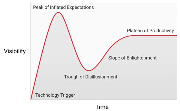 第三阶段是幻觉破灭期:随着实验和实施的失败,人们对新技术的兴趣开始减弱,技术生产商草草收尾或以失败告终。幸存者只有不断提高他们的产品质量,修补产品短板,提升实力去迎合消费者的需求,并达到早期采用者们的需求才能获得更多投资。