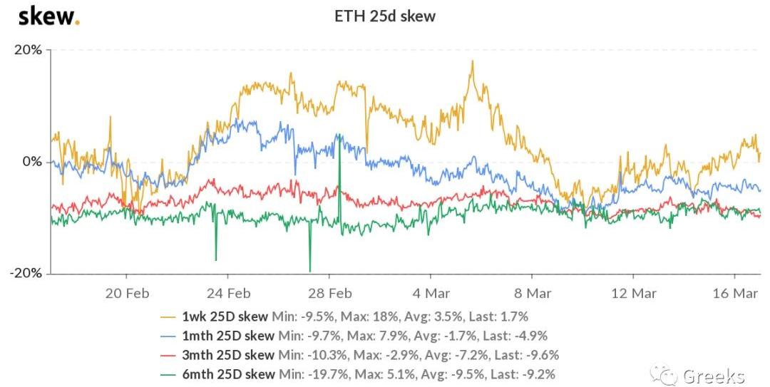 播报数据由Greeks.live和Skew.com提供。比特币价格出现了一波反弹,最近几天大宗交易市场随着行情的波动也出现了非常明显的变化。下跌前平值看涨期权成交比较多,下跌后平值看跌成交比较多,现在反弹中虚值看涨成交比较多。现在这种成交态势已经呈现规律化,市场也越来越成熟。BTC历史波动率10d75%30d84%90d96%1Y70%期权成交量12亿美元,期权持仓量为120亿美元。各标准化期限隐含波动率:今日:1m94%,3m96%,6m96%3/16:1m95%,3m97%,6m97%比特币小幅反弹,各期限IV继续下降。长周期看,市场的波动在不断下降;短周期内市场亦未出现期望的大幅波动之迹象。两个因素共同造成目前的IV下滑,但是因为牛市仍在,IV也不至于降得太低。