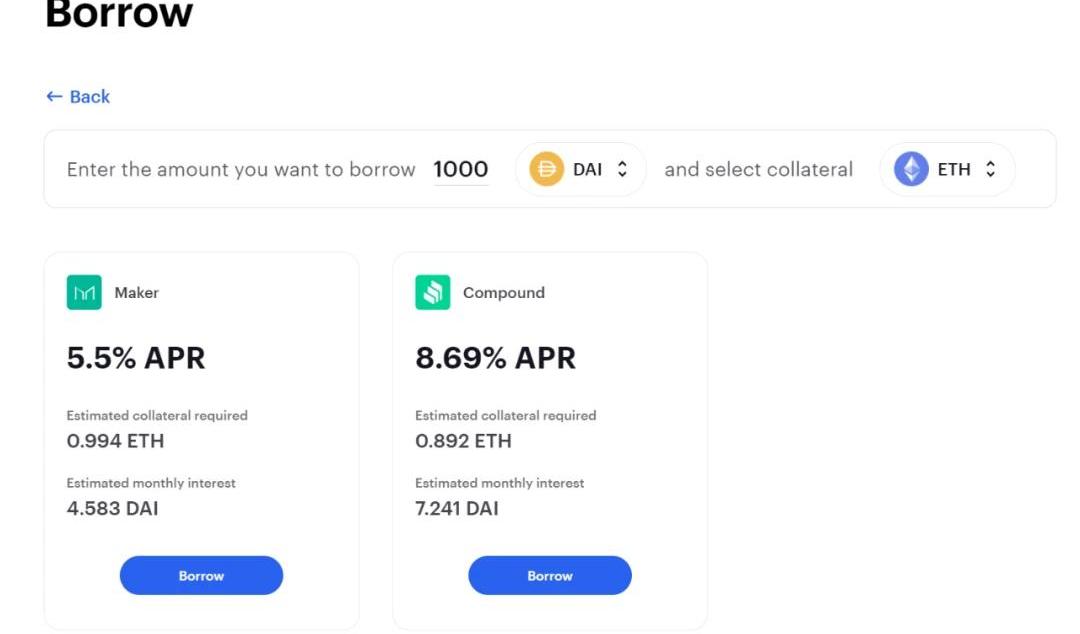 在投资页面,该应用向用户推荐了DefiPulseIndex、SynthsDEFI等DeFi指数代币,同时按照社交代币、layer2等分类向用户推荐了一些知名代币,用户点击后即可看到代币的价格K线以及简介,在页面右侧可以直接购买。同时,用户还可以在该页面查看涨幅最高、跌幅最大的DeFi,以及收益率最高的资金池。Zerion的聚合交易页面功能与Instadapp则差异不大。在储蓄页面,Zerion主要与Cmpound合作,用户抵押其资产即可获得利息收入。在贷款页面,Zerion允许用户选择Maker或者Compound抵押其资产并借出资金。