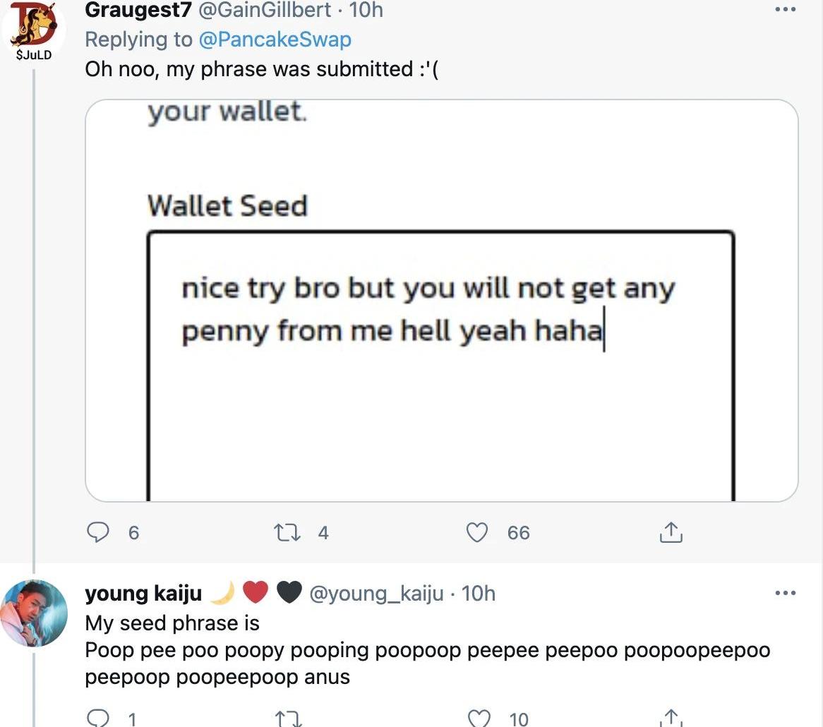 根据Cream官方消息,cream.finance和app.cream.finance均遭到劫持,项目方火速部署了app.creamfinamce.co以供用户临时的使用。经过5个小时的紧急处理,凌晨2点,CreamFinance终于重新夺回DNS,恢复了两个链接的正常使用。另外一边,PancakeSwap在确认遭受攻击后,也很快夺回DNS的控制权。在努力恢复DNS期间,两个项目方一直都不断在强调用户不要提交个人私钥或者助记词,还专门发布推文向用户做出警示,而推文底下的留言也是五花八门。有网友提问:“我把我的助记词输进去了,咋办?”热心网友似乎比他还急:“赶紧和合约交互,把币解锁,把所有的币都转到新的钱包去!快快快!时间有限!”事实上,这也是加密资产一直面临的问题:在掌握资产绝对所有权的同时,用户也必须完全对自己的资产负责。银行账户密码被盗,银行可能会承担一部分责任,可能帮你追回;但私钥被盗,资产被转走,就真的没了。虽然有越来越多的人进入加密市场,开始使用DeFi协议,但还是有很多人并不理解私钥或者助记词的真正含义。需要牢记,任何用钱包与之交互的正常DeFi协议都不会要求用户提供私钥或助记词!用户也需要注意,千万不要把自己的私钥和助记词信息分享给他人!不过,通过DNS劫持来“钓鱼”并非什么很难识别的局,很多久经战场的投资者忍不住在推文下面调侃起来。网友Graugest留言称:“不!我提交了我的助记词!”但点击他发布的截图,我们会看到他提交的助记词其实是对攻击者的调侃:“的不错,兄弟。不过,你永远不可能从我这拿到一分钱,哈哈哈哈。”