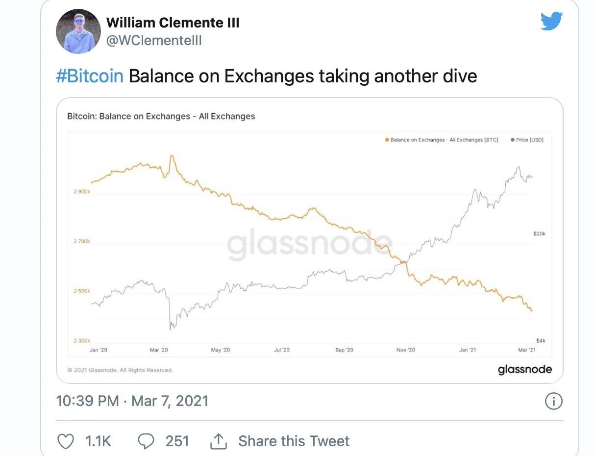 比特币的价格本周表现良好,在撰写本文时,这个领先的加密资产目前正在以53,820美元的价格进行交易。上周,价格低得多,2月28日在Bitstamp达到43,171美元的低点。同时,链上数据显示,流行的交易平台上持有的比特币交易余额仍在耗尽。3月7日,大学二年级金融专业的威廉·克莱门特三世在推特上发布了有关交易所的比特币余额的另一条推文。Clemente分享了来自链上加密分析门户网站Glassnode的图表。