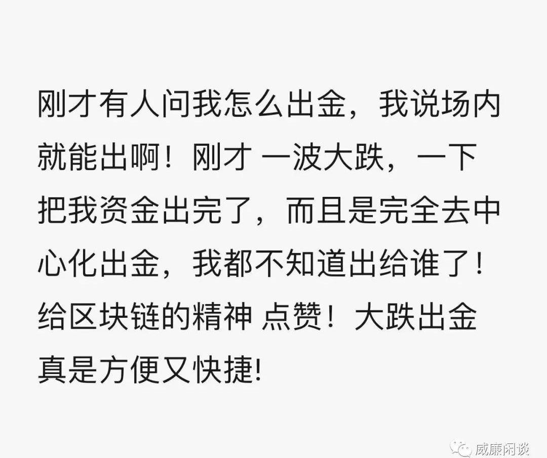我宣布这轮“特斯拉底”正式成立,我们要一起守护马本聪的围笑。总之,暴风雨再猛烈,该承受承受,承受过了还活着不就能看到雨后的彩虹了吗?如果让我评价这轮下跌,就俩字:舒服。杠杆清干净了,狂热气氛消失了,圈外重新开始骂比特币局了,一切都像极了比特币最惨的时候,上一次最惨的时候比特币价格是3500,这次却是45000.太舒服了,未来可期。---------------附:昨天的一些段子,解解闷: