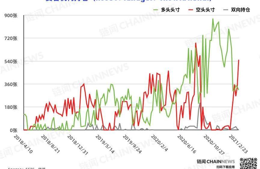 散户持仓方面,多头头寸自3508张下降至2892张,空头头寸自760张上升至908张。散户账户在最新统计周期内进行了态度明确的净空调仓,多空持仓比数据中多单占比降至近26周新低。散户又一次做出了顺应市场运行趋势的仓位调整。