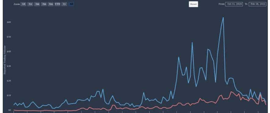 在过去几个月,这两个平台之间最显着的差异之一是——现金流的产生。在2021年3月,UNI社区将有能力将平台上所有费用的0.05%转移到由UNI代币管理的Uniswap资金库中。费用将在资金库中累积,并由UNI代币的持有人投票决定如何处理这些资金。自2020年9月创建以来,SushiSwap一直收取0.05%的费用,其治理委员会同意将产生的资金用于直接购买SUSHI,并将其授予利益相关者,从而提供直接收入来源。就所产生的费用而言,Uniswap显然暂时居于首位。Uniswap平台拥有大量可用的交易对和大量顶级代币的流动资金池,因此其交易量更高,这为流动资金池和UNI代币持有者带来了更多的现金流。