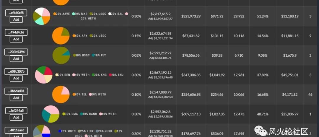 (图看不清的复制上面链接查看)上面红框里是做市的年化收益,也是受最近币价的上涨,有所提升,看锁仓数据也在增量,不过这个收益率暂时只能说还好。目前平台主要交易量和流动性也集中在前三wbtc/weth、bal/weth以及dai/weth,其他的日交易量相对较小,做市商目测有2000-3000个地址。因为可以无许可自行设置各种比例的做市池,所以平台上杂七杂八的交易对还是挺多的。