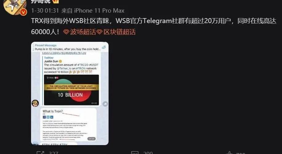 随后当天晚上11点,WallStreetBetsOffice电报群组建,号召其用户用户买入某个加密货币,实现获利,币圈投资者开始蜂拥而入摩拳擦掌,期盼WallStreetBets也能拉动币圈其它项目暴涨,创造下一个财富密码。当时WSB官方公告表示1月30日凌晨1点将公布选中的项目名称,至少会有25倍的收益,并且也透露了相关条件:在币安注册交易,并且该币只有BTC交易对。在在等待的时间中,大家纷纷列出了一长串可能的代币,还纷纷解释WSB可能选择它的原因:SKY,取意「天空」,也属于「马斯克概念币」;GO,取意「向前冲」……不过结果却让所有人大跌眼镜,最终官宣选择的“明星项目”几乎出乎所有人的预料——TRON,并附录波场创始人孙宇晨的个人推文。